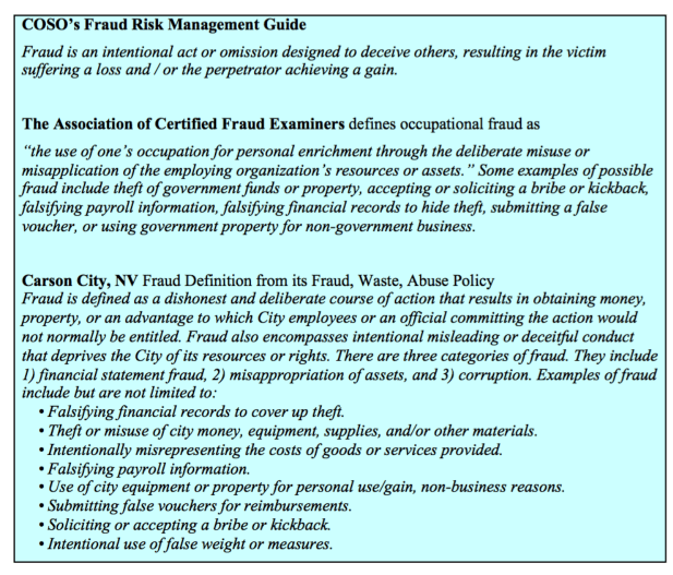As I explained during two tutorials last year, the fraud definition that everyone should have been working with was statement of auditing standards number 99, auditor’s consideration of fraud and financial statement audit.